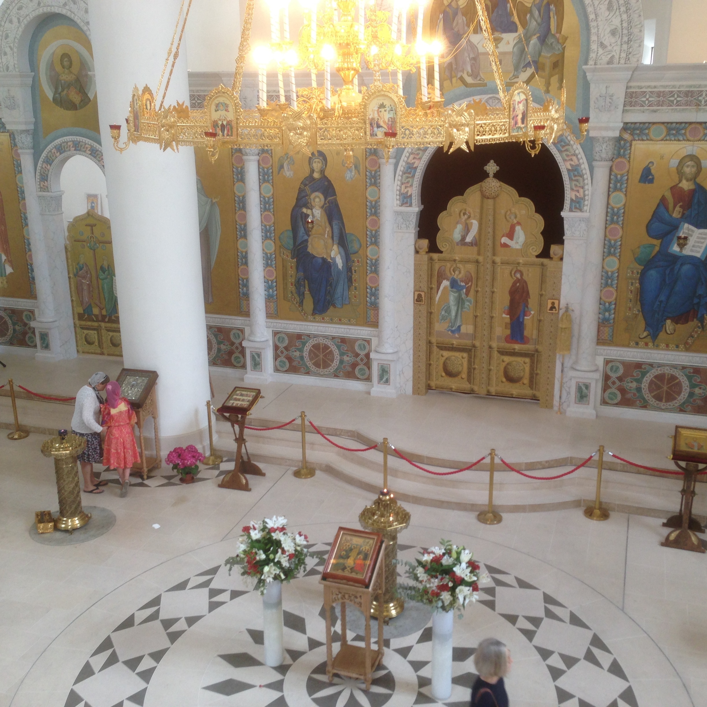 Un imposant lustre doré éclaire l'ensemble mais ce qui surprend c'est l'absence de sièges pour les fidèles bien que les célébrations durent plusieurs heures. Seuls quelques bancs autour des piliers peuvent accueillir les plus fatigués. Quelques popes circulent et vaquent leurs occupations.